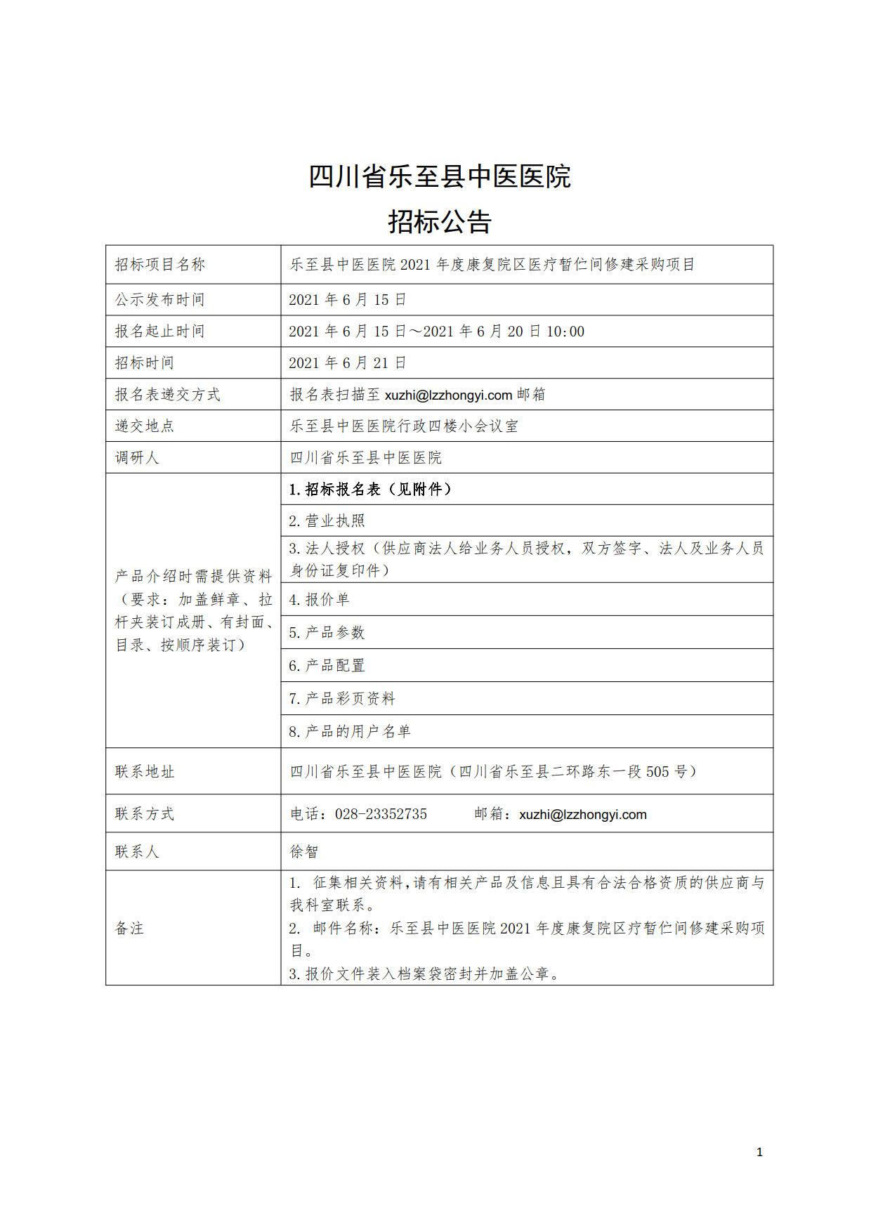 乐至县中医医院2021年度康复院区医疗暂伫间修建采购项目招标公告